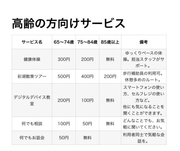 高齢の方向けサービスの料金体制と内容は以下の通りです。