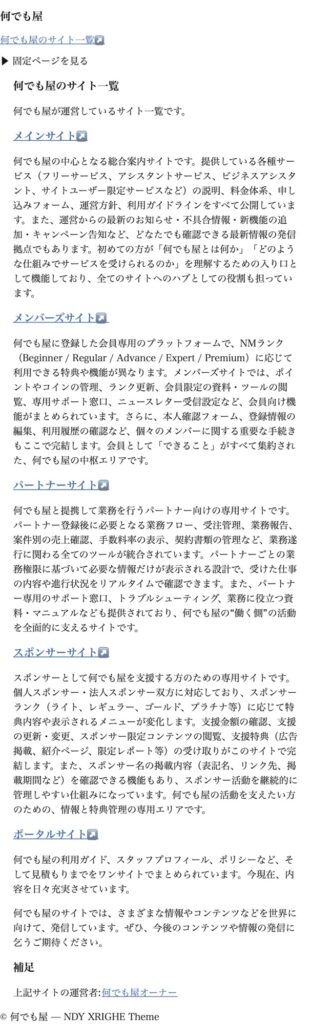 サイトタイトル下の「何でも屋のサイト一覧↗️」は、クリックすると、何でも屋が運営しているサイトの一覧と概要を見ることができます。
