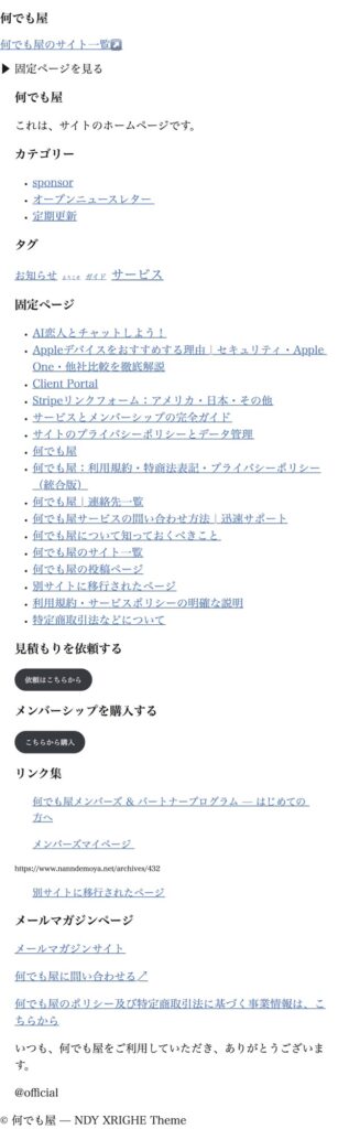 サイト一覧から、何でも屋が運営するすべてのサイトにアクセスできるようになっています。このページをブックマークにしておけば、すぐにアクセスできます。